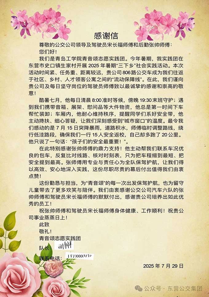 近日,青島工學院青音頌志愿團發來一封感謝信,感謝東營市公交集團駕駛員宋長福師傅熱情服務。原來,在今年...